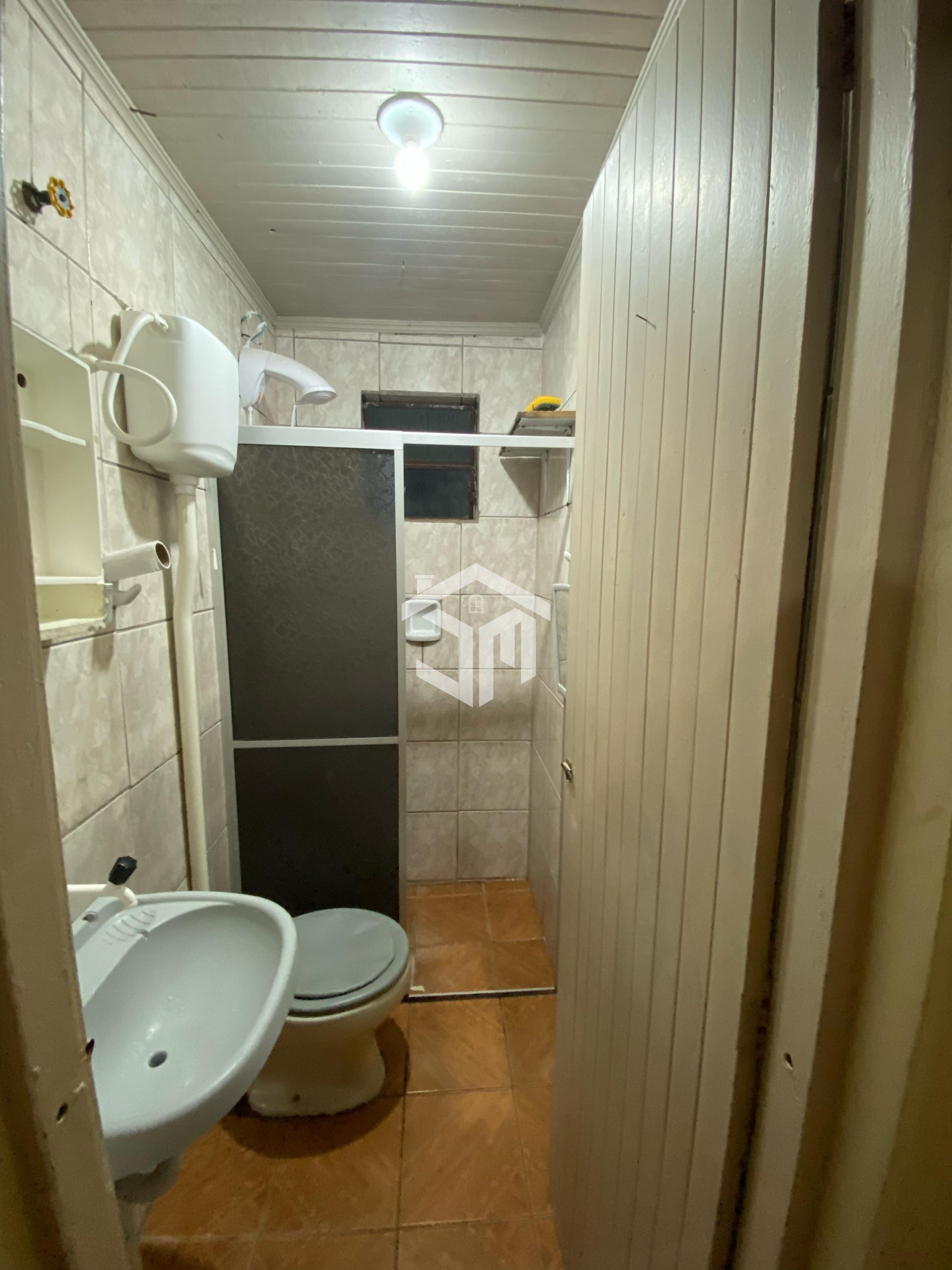 Banheiro: Banheiro social com chuveiro e revestimento cerâmico, em bom estado de conservação.
